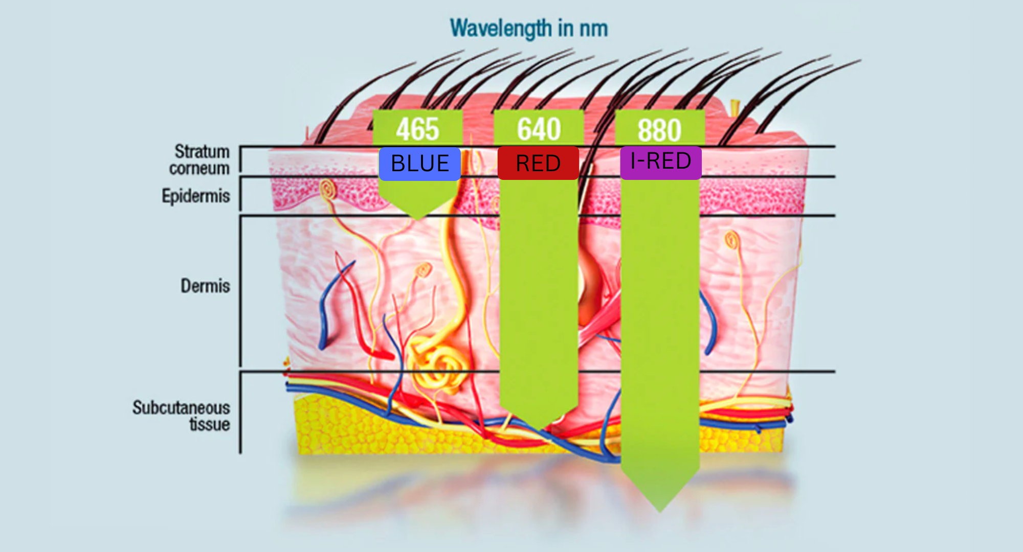 Celluma employs three clinically validated wavelengths, each with a specific purpose: blue light (~465 nm) sits closest to the skin surface and is ideal for targeting acne-causing bacteria within the epidermis; red light (~640 nm) penetrates more deeply into the dermal layer to stimulate collagen, reduce inflammation and promote tissue repair; and near-infrared light (~880 nm) reaches deepest into subcutaneous layers to support deeper circulation, tissue healing and metabolic activity. These differing penetration depths allow Celluma to be effective across a range of protocols, from skin rejuvenation and wrinkle reduction to inflammation support and improved tissue resilience.